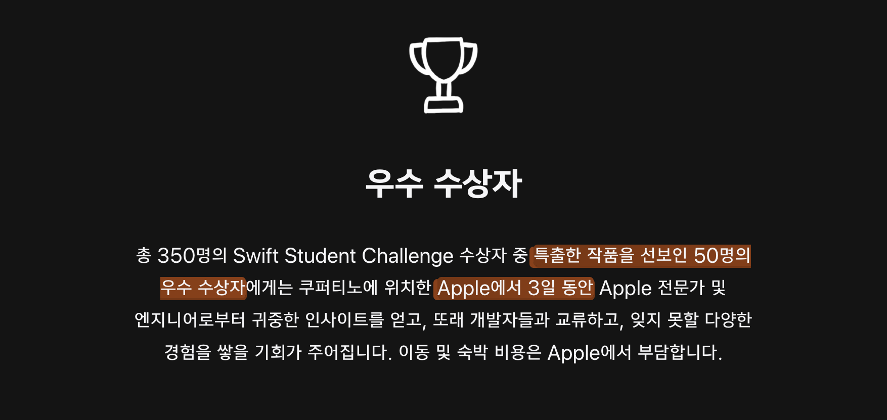 Swift Student Challenge는 애플이 매년 전 세계 학생들을 대상으로 개최하는 공모전입니다. 350명 안에 들면 애플 굿즈와 상장 등 다양한 혜택을 받을 수 있고, 그중에서도 50명의 우수 수상자로 선정된다면 WWDC에 초대되어 2박 3일 동안 Apple 엔지니어들과 함께 잊지 못할 경험을 쌓을 수 있다고 합니다.